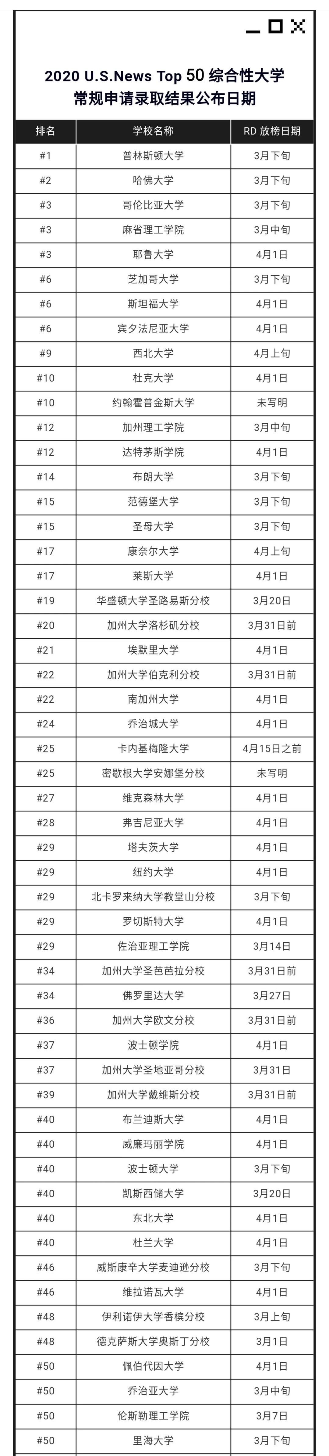 首页 > 顾问主页 > 2020年美国Top50综合大学放榜时间汇总