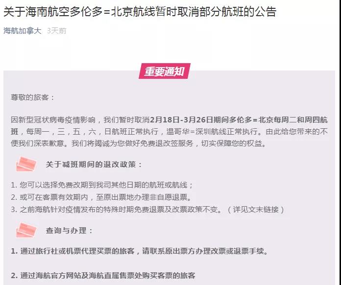 加拿大来往中国的多个航空公司 目前也有不少停飞或取消部分航班~