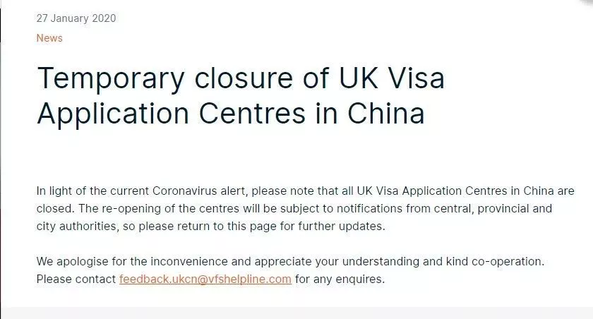 受冠状病毒疫情影响,中国的签证中心正处于关闭状态,目前开放时间无确定日期。这将导致在中国的申请人无法完成英国签证申请,现在还无法确定重新开放的时间。作为全球的合作伙伴,我们会持续更新信息。请保持登录VFS Global网站关注更新:https://www.vfsglobal.co.uk/cn/en/news/china-visa-application-centres-closure