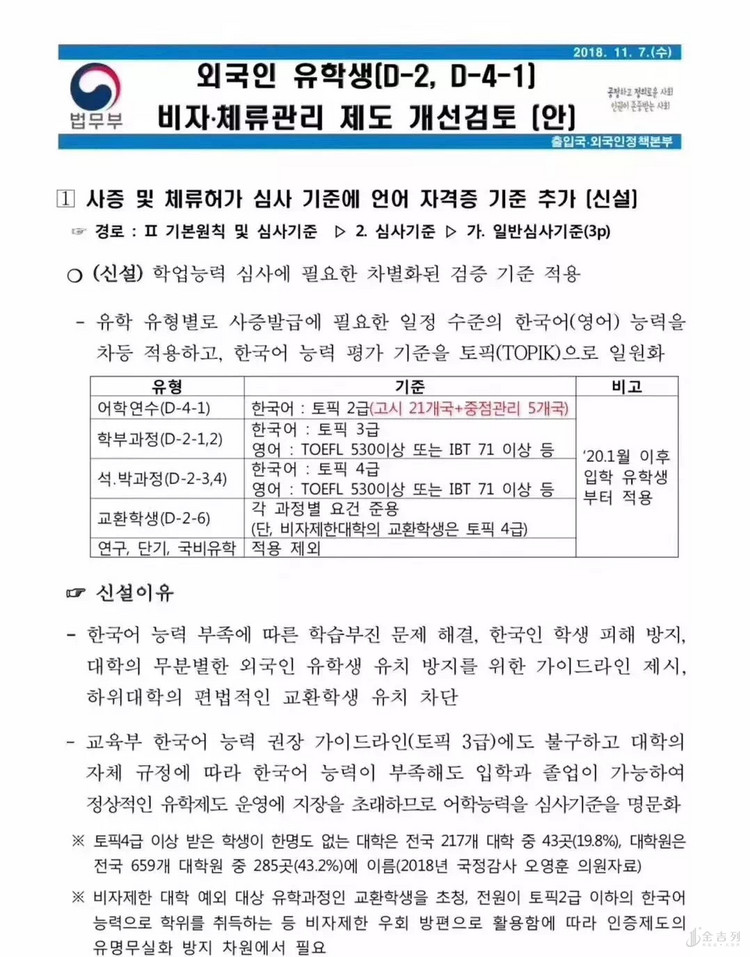 上面文件是韩国法务部2018年底颁布的关于申请韩国留学签证语言级别的公示。