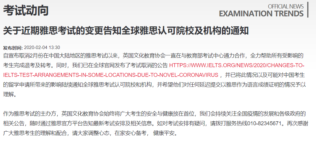 自宣布取消2月份在中国大陆地区的雅思考试以来,英国文化教育协会一直在与教育部考试中心通力合作,全力帮助所有受影响的考生完成退考及转考。同时,我们已在全球官网发布了考试取消公告: HTTPS://WWW.IELTS.ORG/NEWS/2020/CHANGES-TO-IELTS-TEST-ARRANGEMENTS-IN-SOME-LOCATIONS-DUE-TO-NOVEL-CORONAVIRUS, 并已将此情况以及可能对中国考生的留学申请所带来的影响陆续通知全球雅思考试认可院校和机构,并希望他们对任何延迟提交以雅思作为语言成绩证明的情况予以理解。