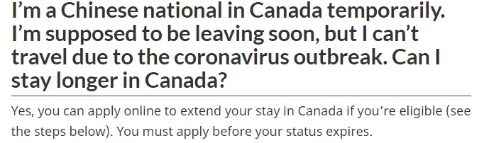 在加拿大境内、合法身份即将到期但由于旅行限制而不能前往中国大陆的中国游客、留学生以及外国劳工,如果有资格,可以申请延期。