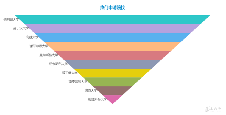 热门申请院校中,按照发出申请的数量来看,排名前列的分别为伯明翰大学、诺丁汉大学、利兹大学、谢菲尔德大学、曼彻斯特大学、纽卡斯尔大学、爱丁堡大学等,这些院校中,大部分都是QS世界大学排名中的百强院校。