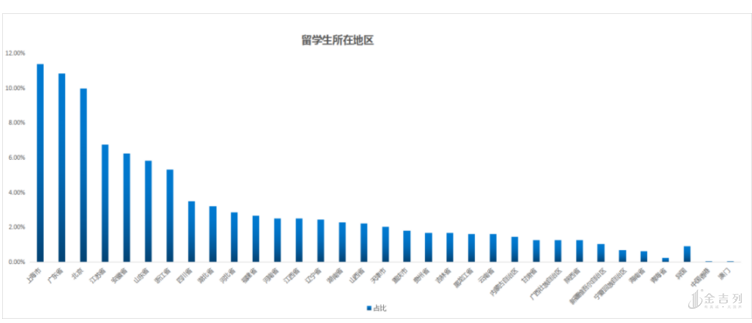 留学生所在地区中,北上广一线城市还是主力。拥有中国较好的教育资源,此外,还有很多身在国外的留学生,在感受国外教育的之后,选择继续深造。