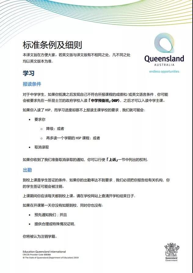 为保障国际学生在昆士兰公校的学业进展及生活安全,昆士兰国际教育(EQI)颁布了 最新 中文版 《标准条例及细则》, 其中包含了对于学生学习、校内行为、转学、住宿、外出活动、医疗、签证、费用及其他权益与责任等方面的规范条例及解释说明。 若需参考英文版请浏览: