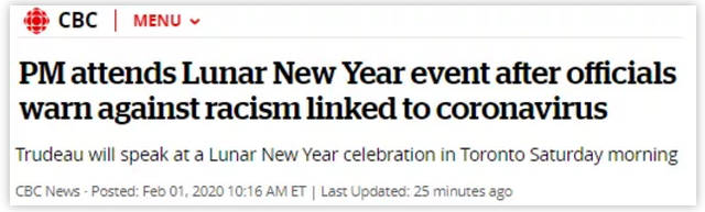 此前加拿大卫生部长表示,不会宣布国家进入紧急状态。总理特鲁多在农历新年活动中表示:在加拿大,因害怕和误导信息而出现的歧视,从不被允许!