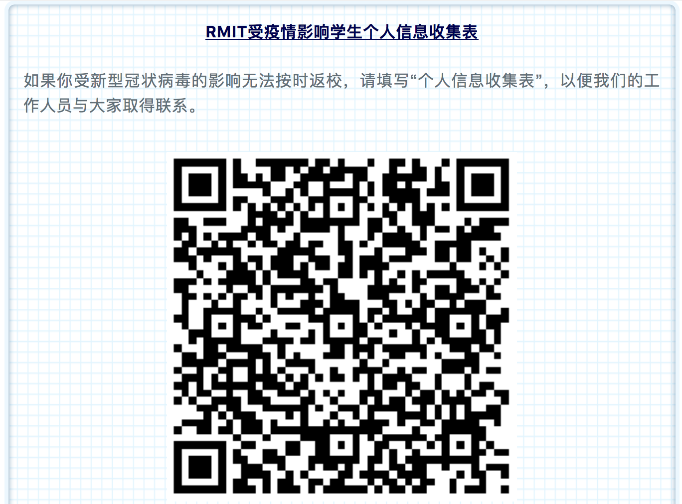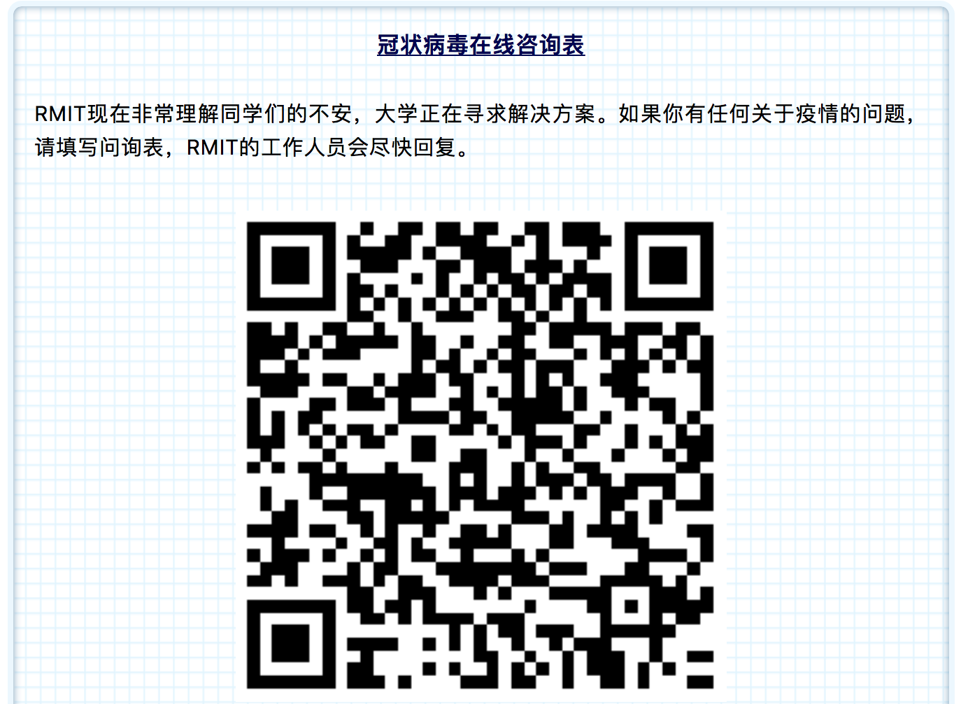 由于疫情不断变化,RMIT皇家墨尔本理工大学将持续根据专家的建议采取措施,并会告知学生。请大家持续访问RMIT学生网站的冠状病毒信息页面,以随时了解最新信息,并查看常见问题解答: