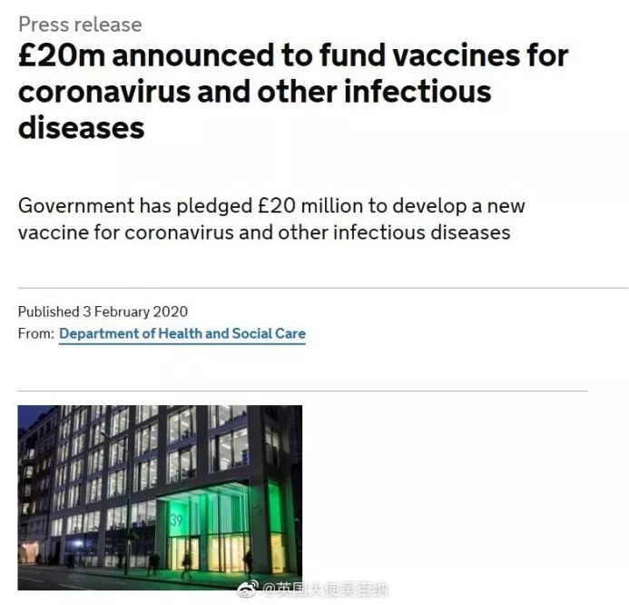 英国卫生部近日宣布将投入2000万英镑研发疫苗来抗击全球最致命的疾病,包括正在爆发的新型冠状病毒肺炎。同时,英国国家科研与创新署将与英国卫生部一同,为针对新型冠状病毒肺炎的研究额外提供2000万英镑的资金支持。
