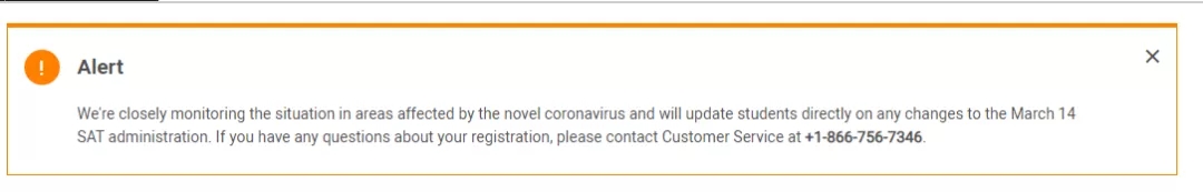 在各项考试中,同学和家长最关心的还是 3月份的SAT考试 。随着疫情的蔓延,很多国家和地区都开始限制中国大陆公民入境,包括中国大陆学生常去参加SAT的新加坡,马来西亚,韩国,日本,菲律宾,中国香港等,要么禁止入境,要么暂停发放落地签证,后者暂停办理签注(如港澳),CB也在密切关注新冠肺炎疫情引起的3月14日的SAT注册变化。以下截图来自College Boar官网