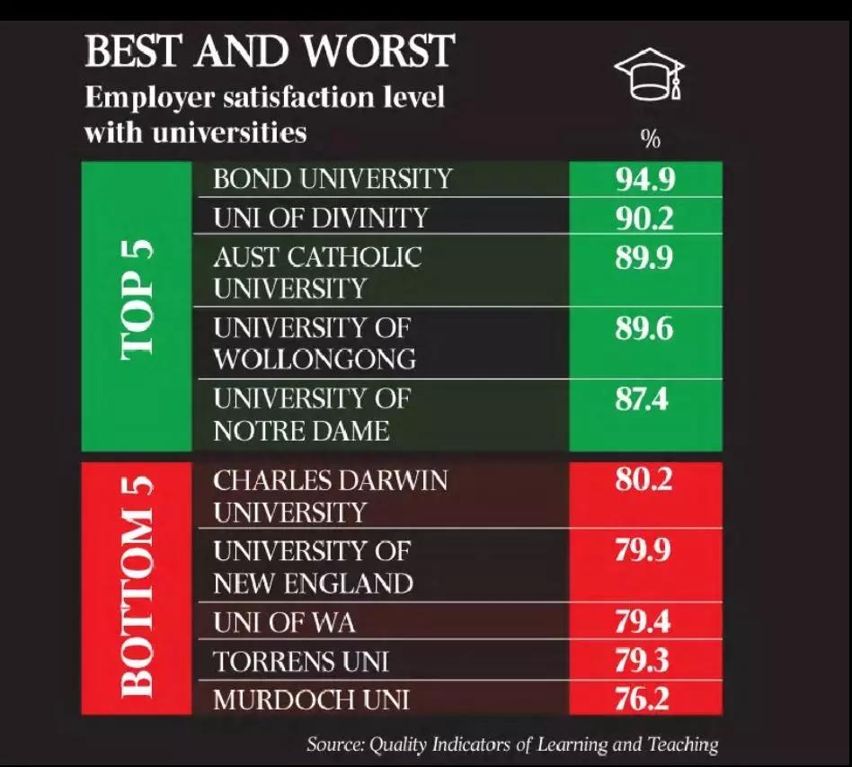 近日, ” 2019 Employer Satisfaction Survey – 2019毕业生雇主满意度的调查” 新鲜出炉。这份由应届毕业生的直属领导提供直接反馈的结果显示: 邦德大学毕业生的满意度高达 94.9% ,高居榜首, 远超澳大利亚大学满意度的平均水平84.3%,吊打名气 大的学校。