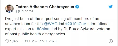 Teros在其推特个人账户上说,他刚去机场送别了由世卫组织领导的国际专家组,他们正飞往中国,将实地调查新冠病毒疫情。
