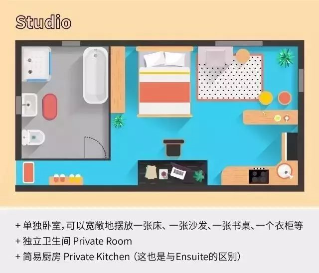 房型即一室一厅公寓,可以理解为国内的单身公寓,有独立的客厅、卧室、卫生间和厨房。