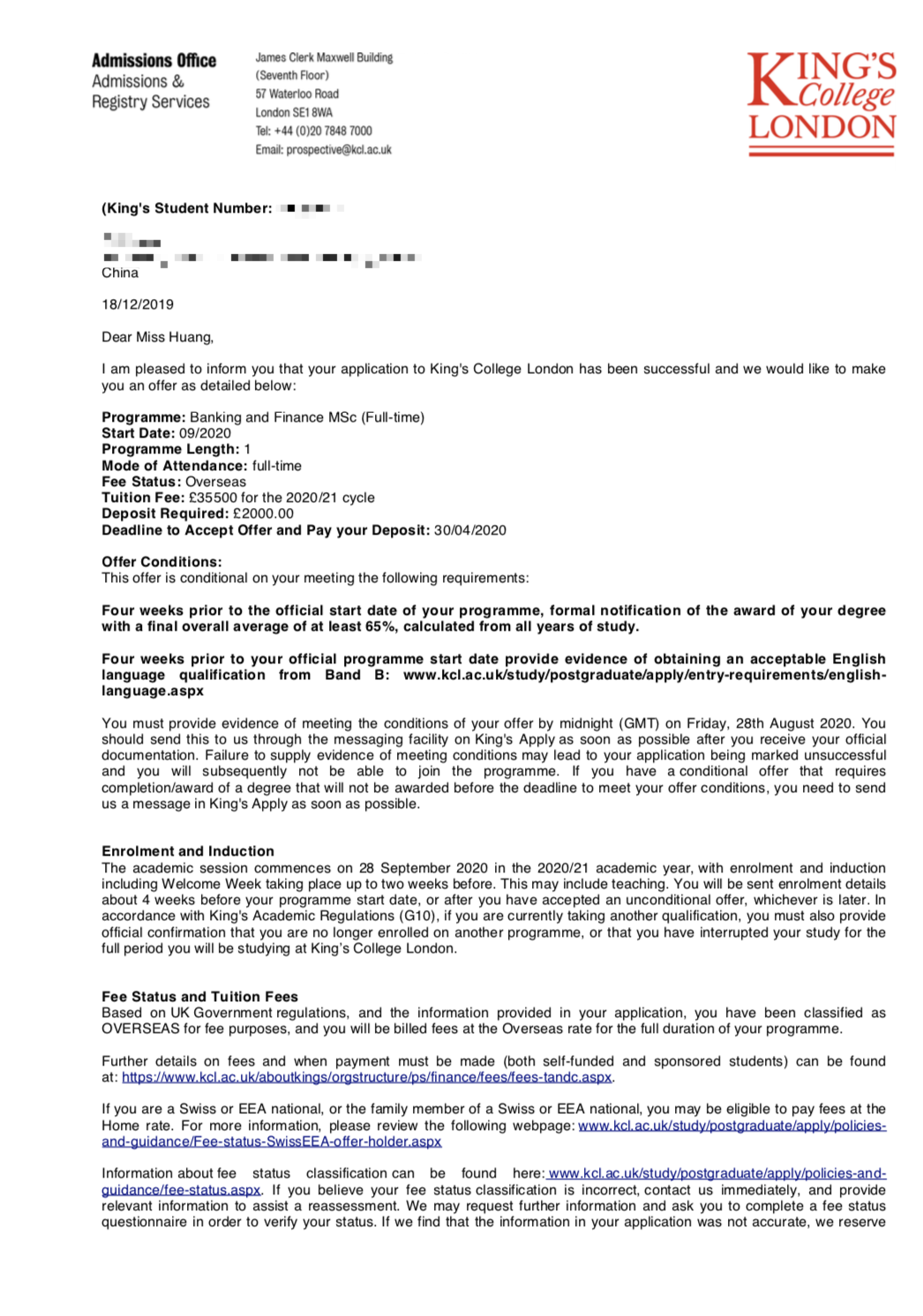 考虑到今年英国申请的人暴增,学生更是担心学校的审理情况,过程中我们积极的宽慰学生也鼓励学生先耐心准备雅思考试,终于斩获了这枚录取。