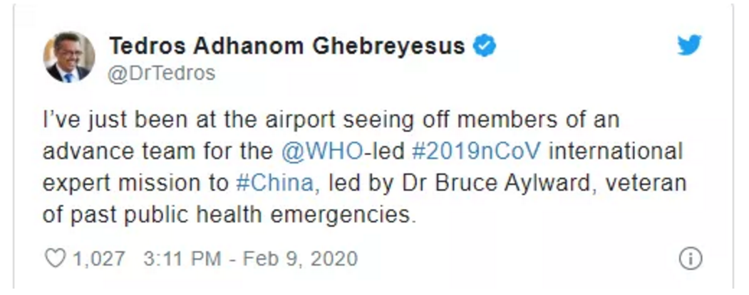 在新冠病毒肺炎疫情不断恶化的情况下,世界卫生组织向中国派出的新冠病毒防疫专家团已动身前往中国首都北京,帮助调查新冠病毒的传染途径、并希望找到有效的防治措施。率领这一世界卫生组织专家团的是加拿大传染病医疗专家Bruce Aylwar。世界卫生组织的这一新冠病毒专家团被准许进入中国大陆参加新冠病毒肺炎的疫情调查工作,是半个月前访问北京的世界卫生组织负责人Teros Ahanom Ghebreyesus与中国达成的协议。Teros在其推特个人账户上说,他刚去机场送别了由世卫组织领导的国际专家组,他们正飞往中国,将实地调查新冠病毒疫情。