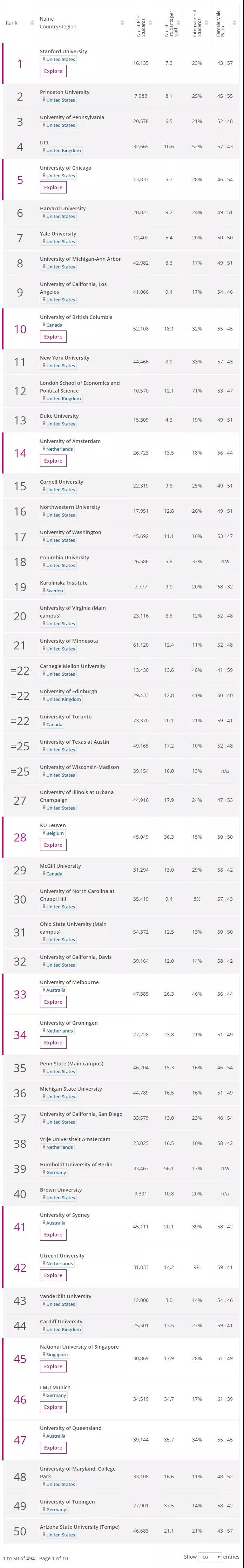 泰晤士高等教育(THE)更新了2020世界大学 心理学专业 排名,今年共有 494所 大学入榜,高于去年的463所。
