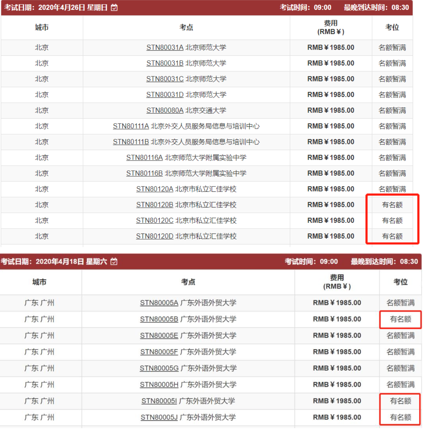 - 北京考点 3月 考位 暂满, 4月18日、4月26日场次有考位