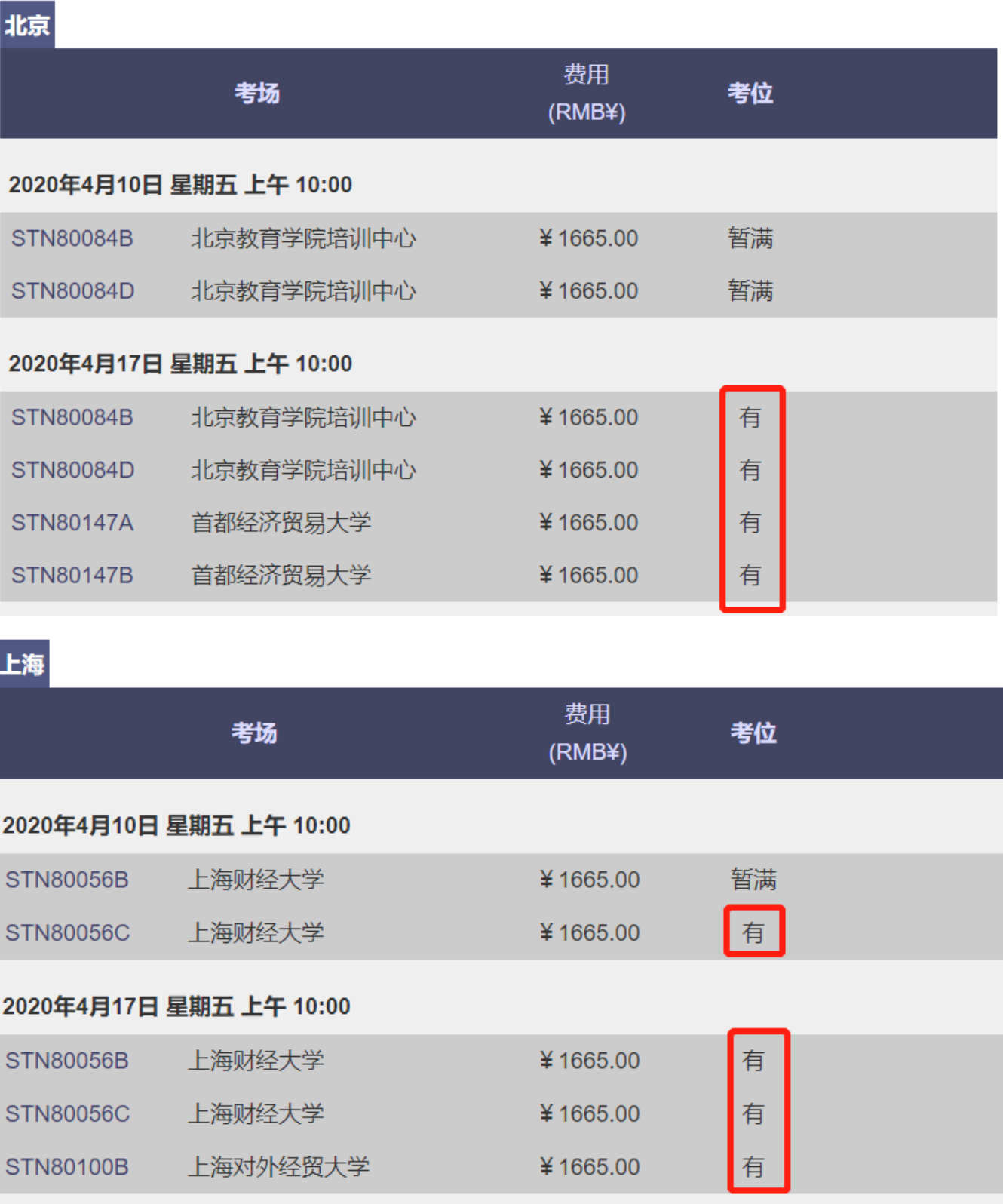 - 上海考点 3月考位暂满 ,4月10日,4月17日,4月25日场次有考位