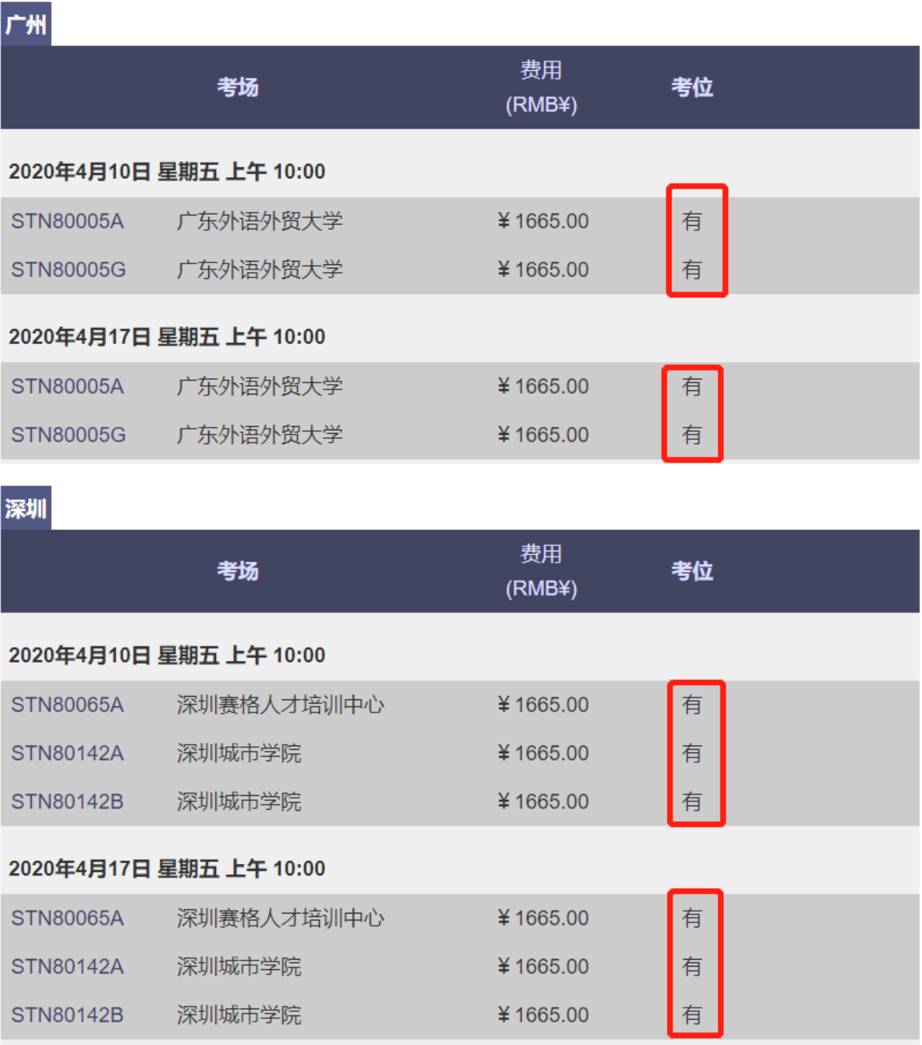 - 深圳考点 3月考位暂满 ,4月10日,4月17日,4月25日场次有考位
