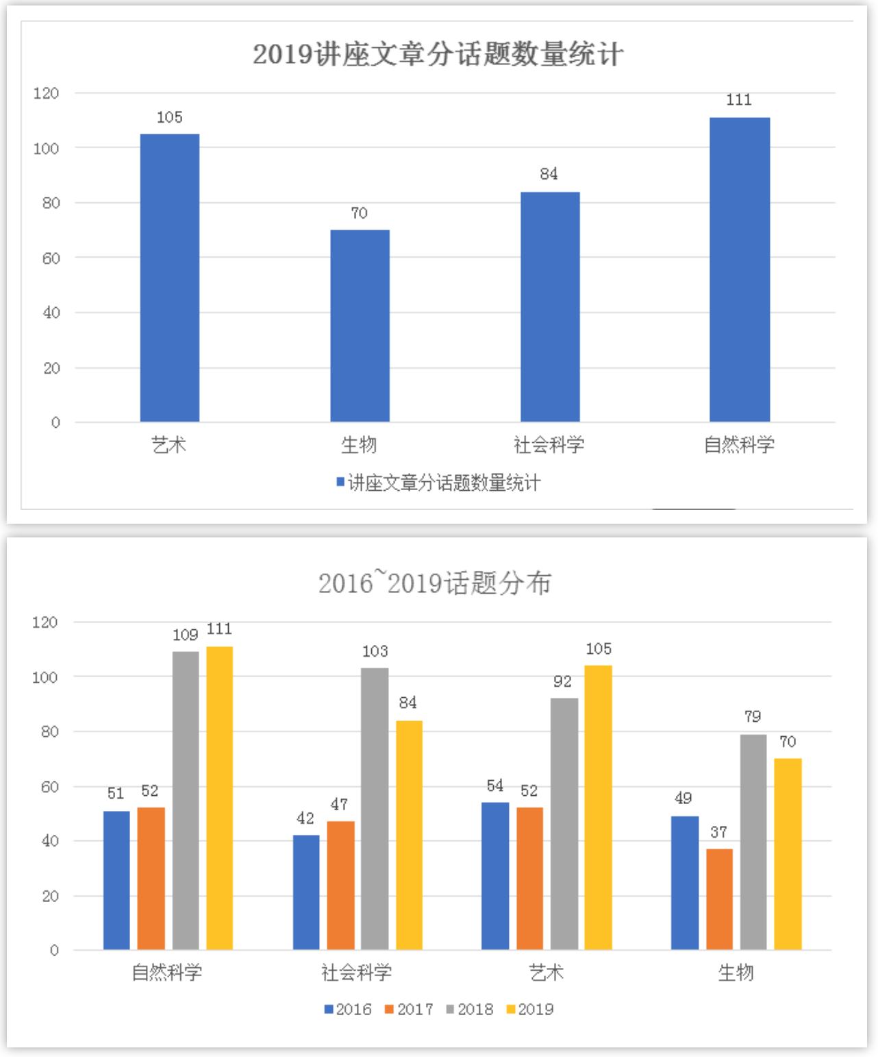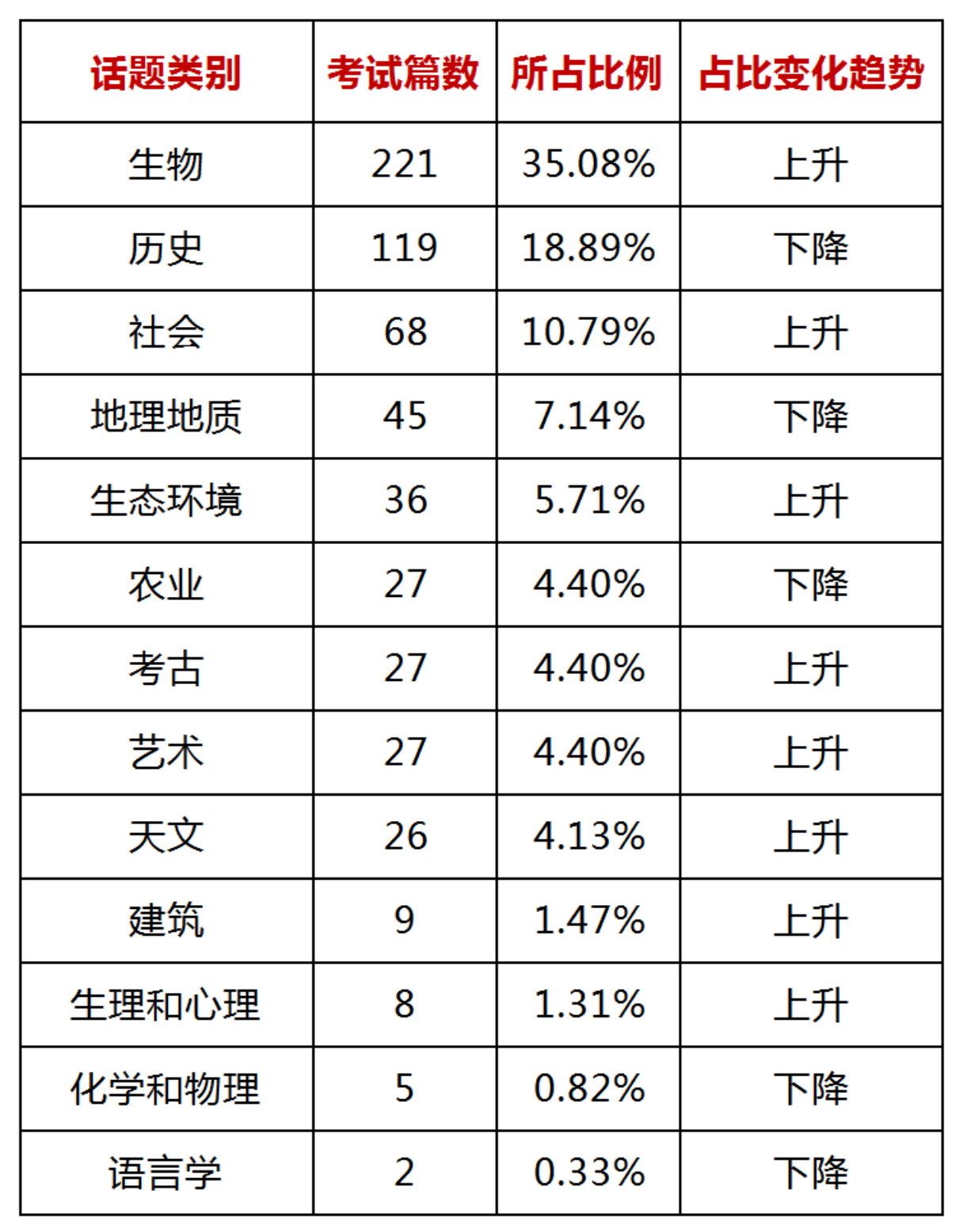 话题考查方面,2019年高频话题的分布变化不大, 生物类和历史类仍然是考查最为频繁的话题,但是天文类和社会类话题明显增加, 并且新增话题语言学和文学。