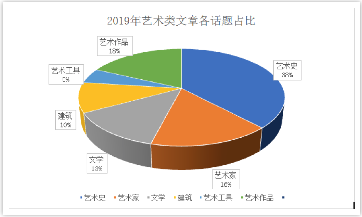 艺术类 题材与2017年和2018年相比呈现相对稳定的态势,也是每场必现的一个科目,占到28%,一直是考察的重点学科,考察的内容仍然涉及艺术家、艺术史、艺术作品、建筑、文学等方面。