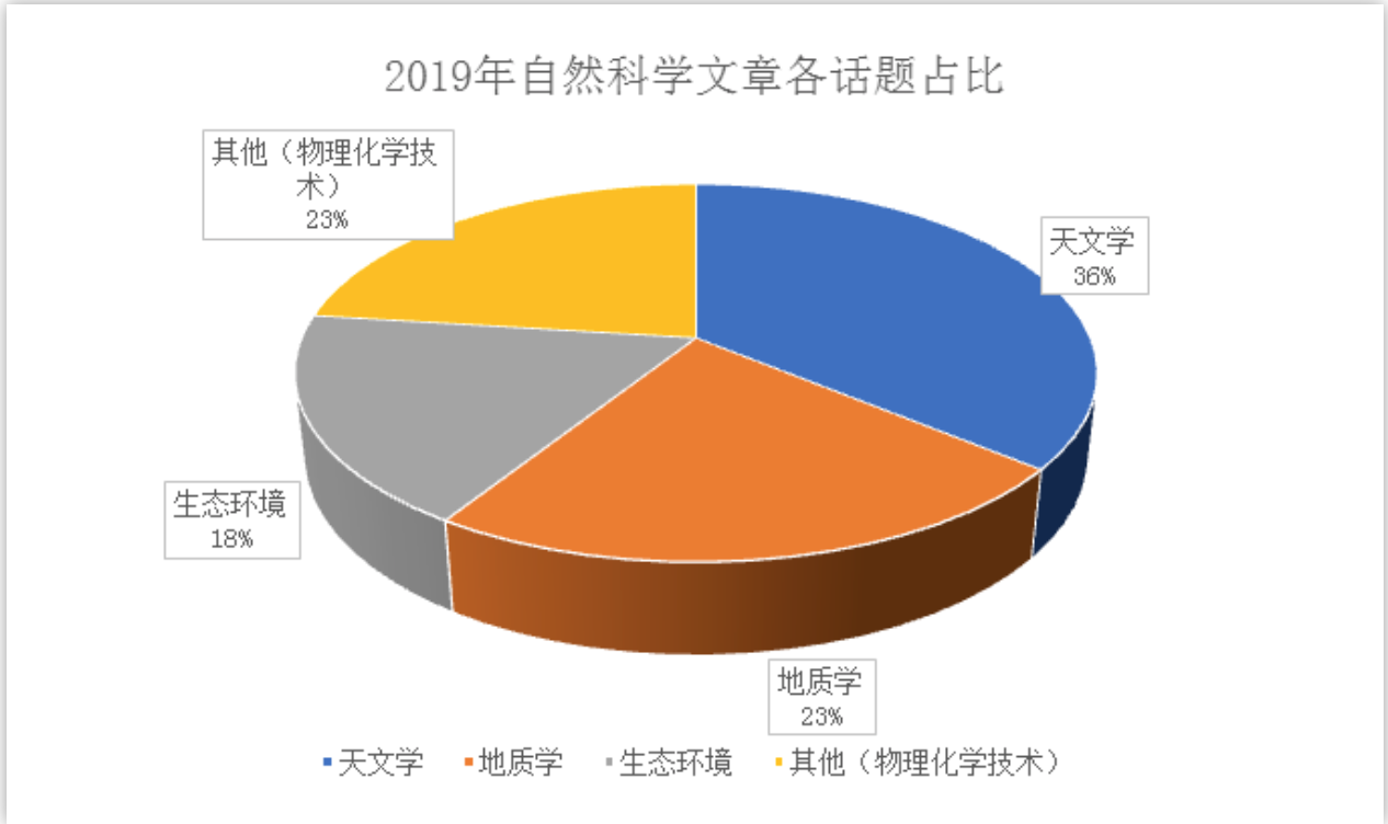 自然科学类 今年考频和去年相比有小幅度提升,约为31%,18年占比28%,涉及天文,地理地质,生态环境,物理化学等内容,内容非常庞杂。但自然科学类别下的各小学科又各有千秋,要求大家在备考时既然做到面面俱到又要有的放矢。