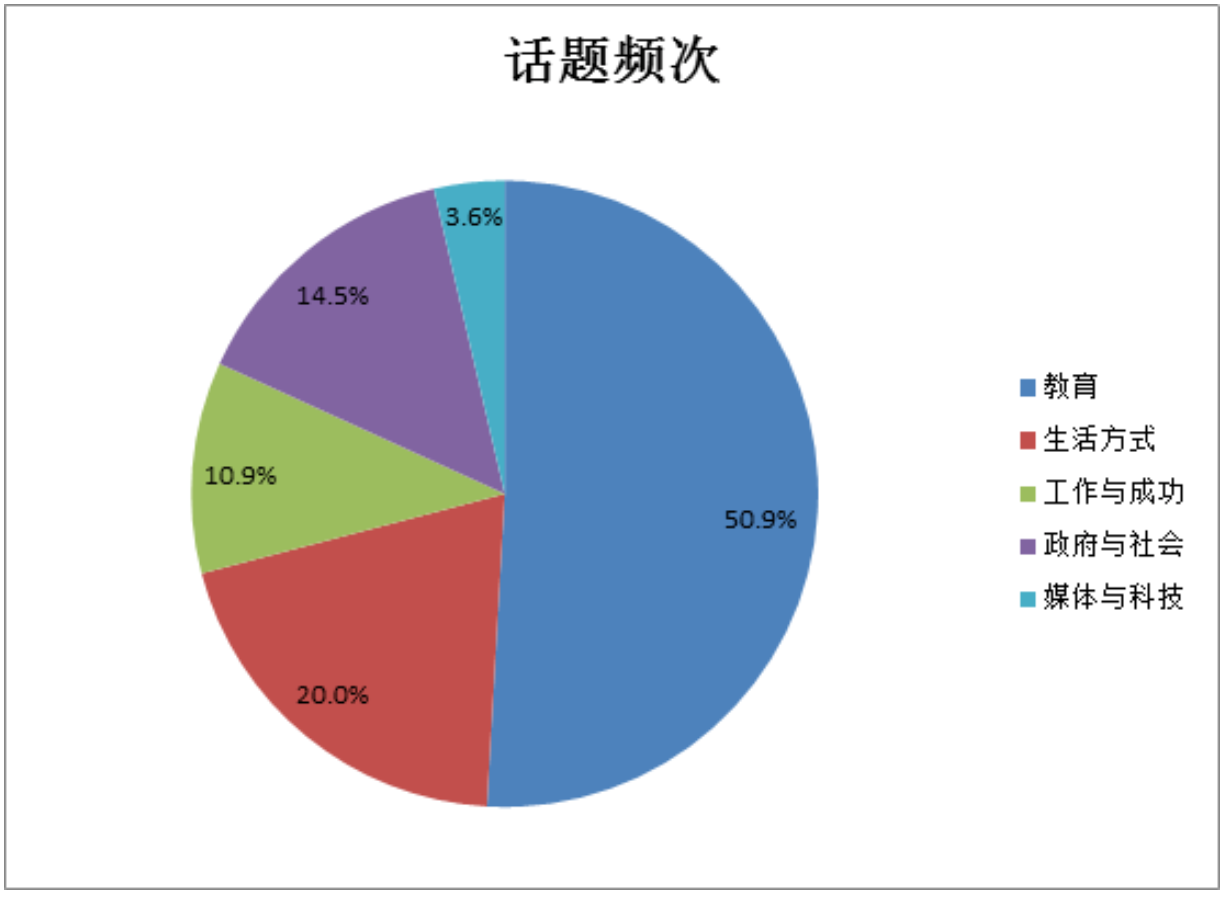 教育类话题今年所占比重为31%,相比于去年的32%基本持平。教育类话题由于更加贴近考生日常学习生活,所以和生活类各占独立题目的半边天,考生比较擅长说和自己的学习生活或者校园的普通生活的题目,但是对于选课程和校园里面的工作比较生疏。