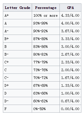 上面是一种较为常见的 Graing Scale,但是相对而言较为严格,按照这种方式计算出来的 GPA 会比较低。