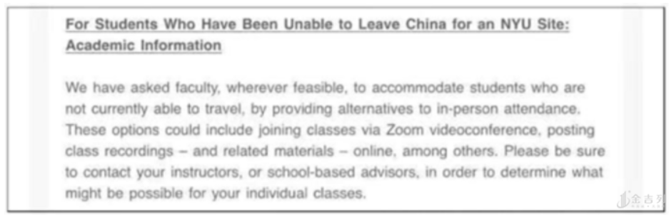 对于假期结束但无法返校的学生,NYU官方给予的回应是, 学生们可以通过远程视频的方式来上课,包括线上课、替代课,但需要提前和学校联系 。