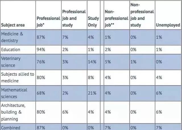 根据此份调查,教育和医科的学生是从事专业工作比例最高的,而艺术、语言类和历史哲学类专业是从事非专业工作(不需要学位的工作)比例最高的。