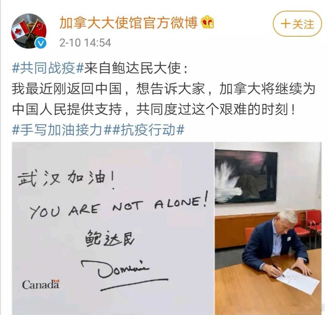 近日,加拿大驻华大使鲍达民在加中关系特别委员会会议上,面对议员的质询时力挺中国。 鲍大使对中国为了阻止病毒扩散,毅然封锁人口多达1100万的城市之举表示赞扬。