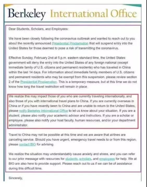 UCB 在全体学生及教职工邮件中写道:“ 如果你滞留中国无法返美,请及时联系我们,说明你的境遇” 。还提到,“大多数高校关注着这场疫情对中国学生的影响,因航班问题无法及时返校的留学生,学校将进行妥善安排”。