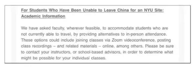 NYU 校方针对收到疫情影响,假期结束却无法返校的学生给出了通知: 可以利用远程视频的方式上课,包括网络课、替代课,需要注意的是,为了决定可选的个人课程,需要提前联系学校。