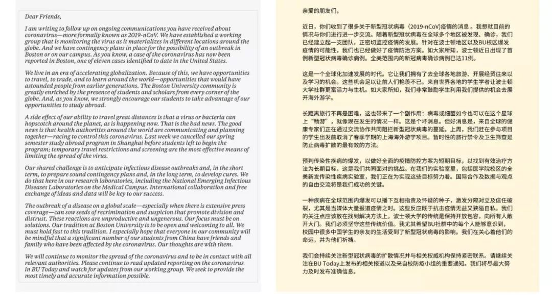波士顿大学校长向波士顿大学全校师生、员工发送邮件表明:“请记住你们是我们这个丰富多元的、国际化的学术社群中重要的、必不可少的一份子。我们重视并理解你们为祖国亲友的安全而担忧的心情,也深知此次疫情对你们的亲友及他们所属的群体所造成的影响。如果你们有任何需要或有任何疑问,我希望你们可以向学校的教师及员工寻求帮助。波士顿大学学生处、学生健康服务中心以及校全体师生随时准备好支持你们。”