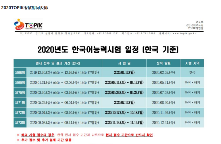 TOPIK考试一年共有6次,其中韩国举办6次,中国内地每年举办2次,中国香港地区每年举办4次,其他国家根据安排举办5次。