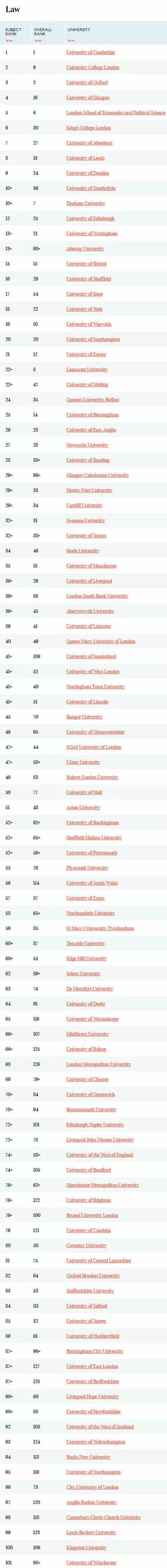 以下是2020年TIMES专业排名 ****Law法律专业 英国大学排名