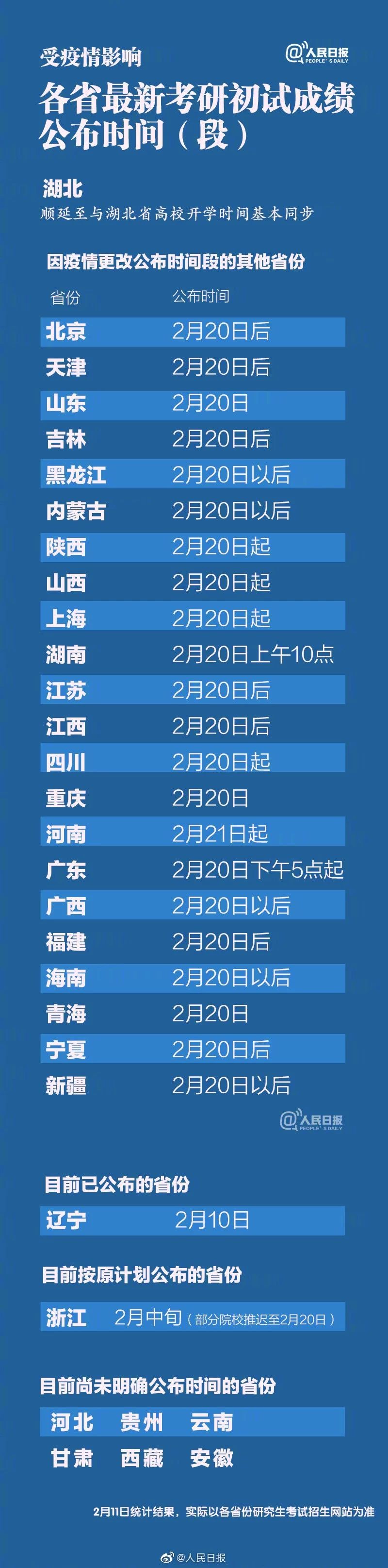 截止目前,只有辽宁省在2月10日公布了2020年硕士研究生招生考试初试成绩,成为全国第一个公布考研成绩的省份。其他多省则发布通知称,将考研初试成绩公布时间推迟,还有河北、贵州、安徽等个别省份尚未公布时间。