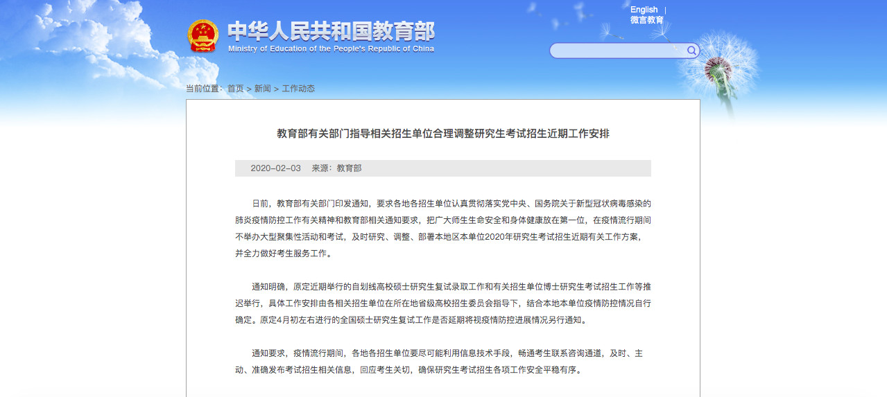 此前,教育部有关部门印发通知,要求各地各招生单位在疫情流行期间不举办大型聚集性活动和考试,及时研究、调整、部署本地区本单位2020年研究生考试招生近期有关工作方案; 原定4月初 进行的研究生复试工作是否延期也将视疫情防控进展情况另行通知。