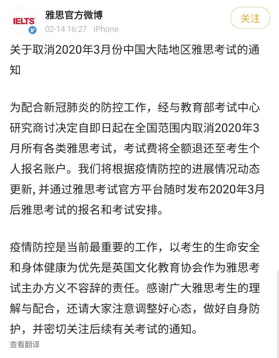 昨天雅思官方微博宣布:为配合新冠肺炎防控,取消中国大陆3月所有类型雅思考试!
