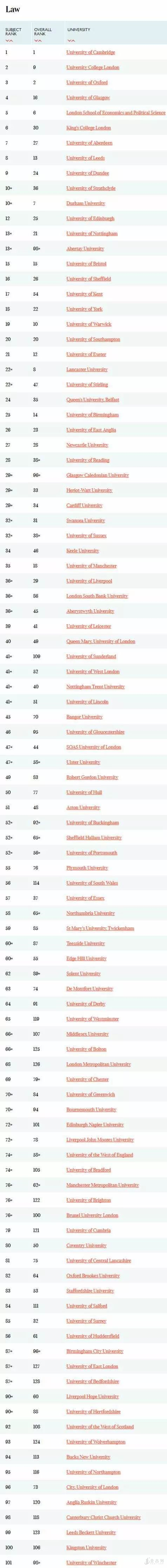 以下是2020年TIMES专业排名-Law法律专业 英国大学排名