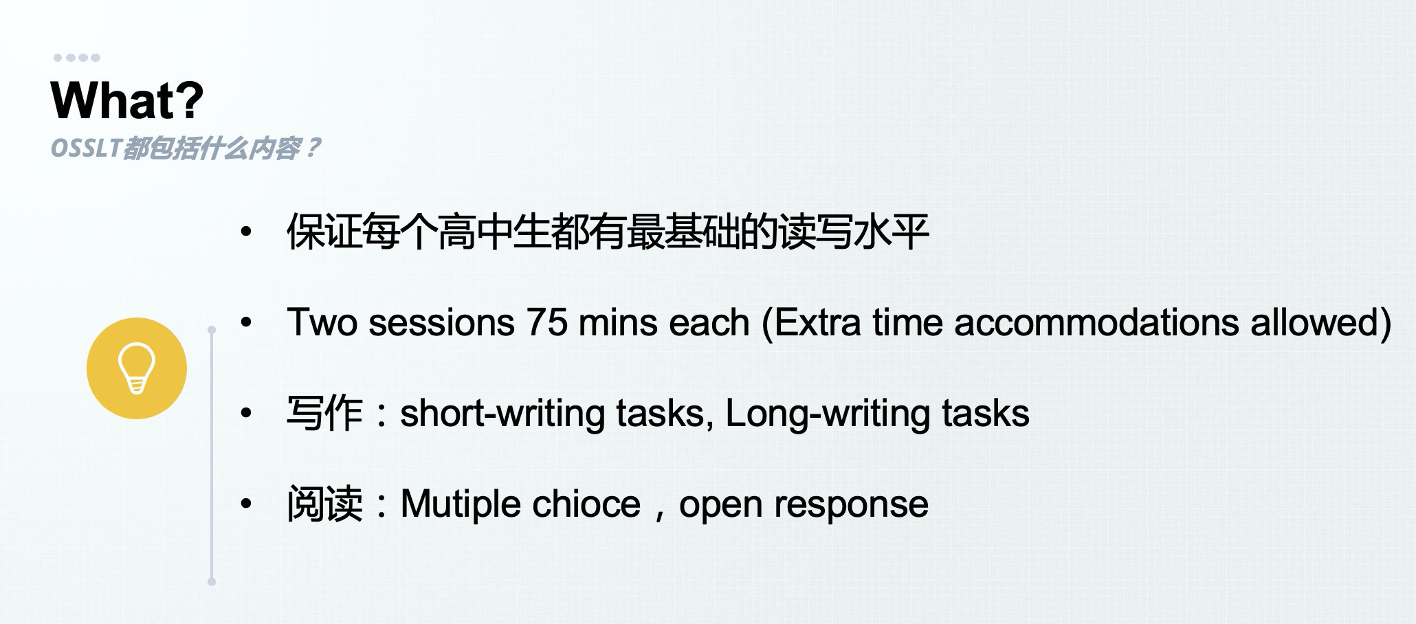 OSSLT 是 Ontario Seconary School Literacy Test 的简称,即“安大略省高中英语读写能力测试”,是针对所有安省 10 年级学生的省级标准测试。安大略省当地学生必须通过该测试才能入读11 年级,而国际学生如果要取得安大略省高中毕业文凭,必须在高中毕业前通过。
