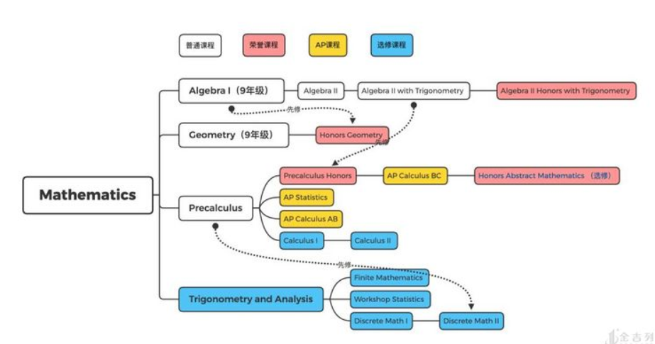 再比如,很多学校数学课程9年级入学时会进行能力测试(Placement Test),根据考试成绩决定数学的学习起点。美国学生通常从最基础的Algebra I或Geometry学起,中国学生数学能力普遍较强,一般会比美国学生高1-2个等级,从Algebra II或Algebra II Honors开始学起,有的甚至9年级就开始学Precalculus。