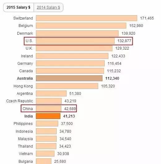 2015年,美国IT行业平均薪水约13万美元,约为中国的3倍(来自MyHiringClub.com网站)