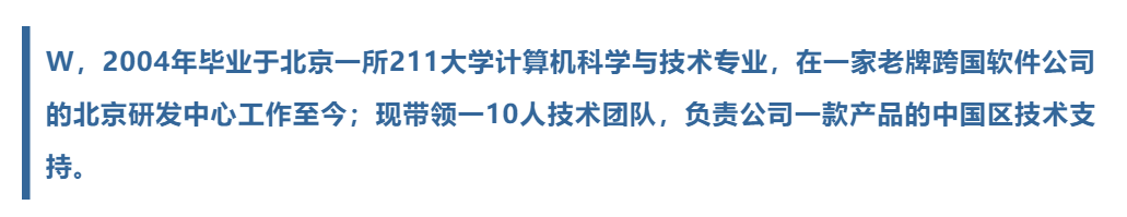 W:我们公司有一款云产品,我们负责从开发环节到生产环境的技术支持问题。我是团队里的Tech Leaer。
