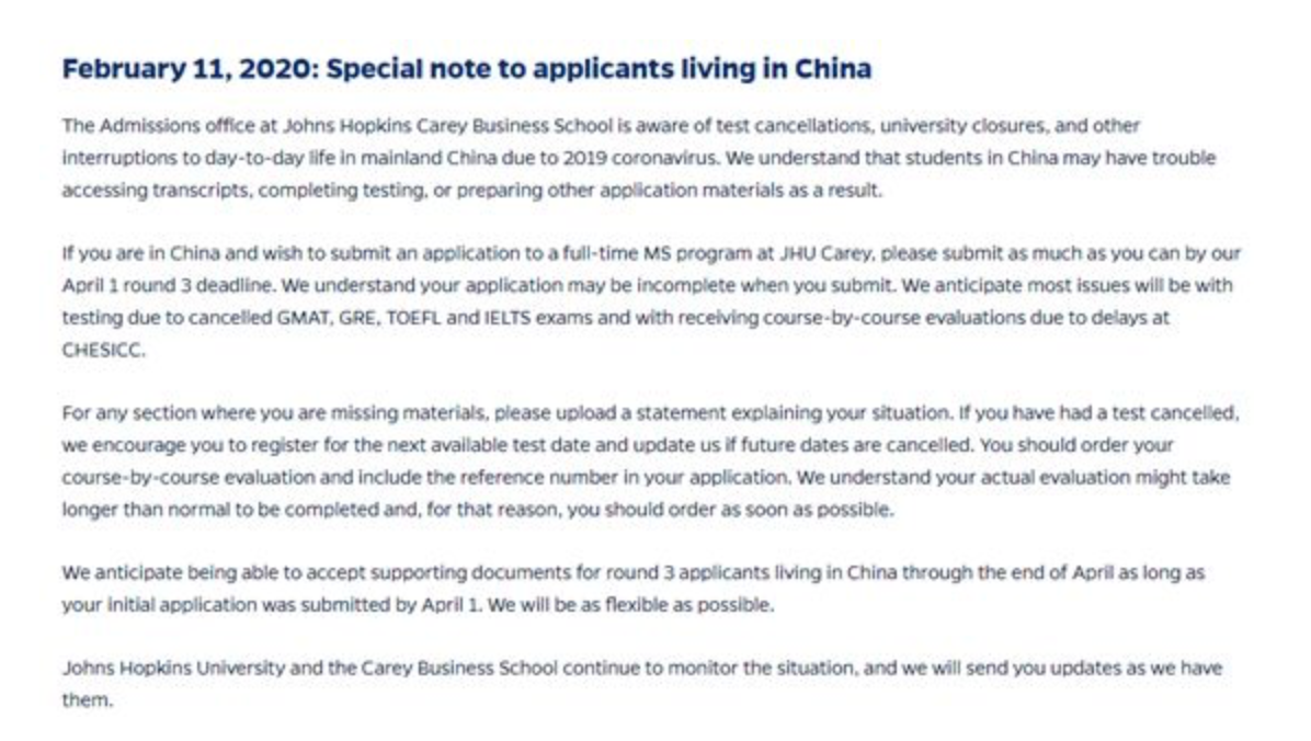 2 月 11 日约翰霍普金斯大学凯瑞商学院招生办公室发布了一条特别的关于中国大陆学生申请的通知,中国大陆学生可以在 4 月 1 日第三轮截止日期前提交申请,对于缺少的材料可在申请时向学校提交声明说明情况,并尽量在 4月底补交 。因为考试被取消的学生,建议注册下一个可用的考试日期,如果以后的日期被取消,及时更新。同时尽早进行成绩认证,出结果可能比正常延迟,但申请时可以附上你的编号,以便学校及时了解你的信息。下面是官网给出的具体信息: