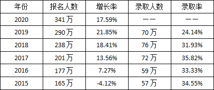 从上图可以看出,每年研究生考试的报考人数逐年增多,但是录取率确是逐年下降,因为录取人数并不会随着报考人数的增加而增加,录取人数是既定好的,那么升学率就会随之下降了。今年的研究生考试结果还没有全部出来,但是今年的报考人数确是近6年来之最,也首次突破了300万大关。
