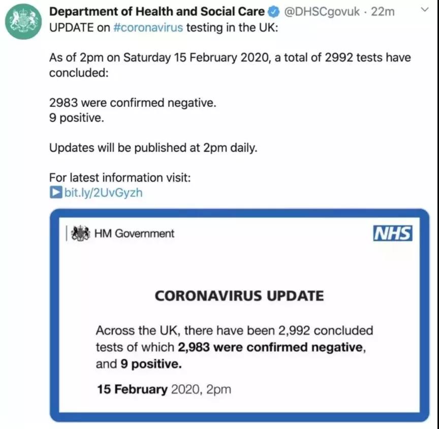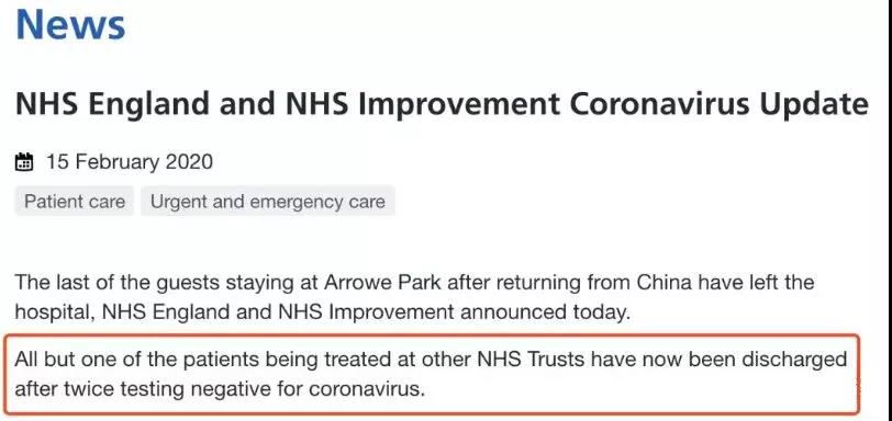 NHS 当天下午发布官方消息称,所有已经出院的患者,都经过了两次新冠肺炎病毒检测,报告结果均呈现阴性,不再携带病毒,均可以安全出院。