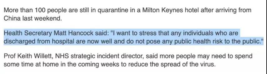 对此,卫生部长马特.汉考克(Matt Hancock)表示:“卫生部在此特别强调,现在出院的任何人,都是在身体健康的情况下, 因此不会对大众构成任何公共健康风险。”
