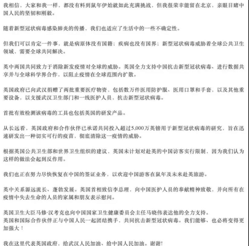 英国驻华大使吴百纳为中国加油全文