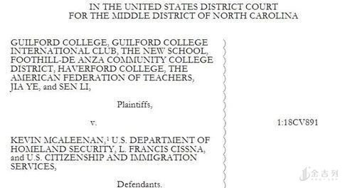 据了解,吉尔福德学院的校长Jane Fernanes,哈弗福德学院(Haverfor College)的前校长Kim Benston,新学院大学(The New School)的校长Davi Van Zant,山麓-迪安萨社区学院(Foothill-De Anza Community College District)的校长 Juy C. Miner,都是美国总统高等教育联盟(Presients’ Alliance on Higher Eucation an Immigration)的成员,他们也是诉讼方的一员。