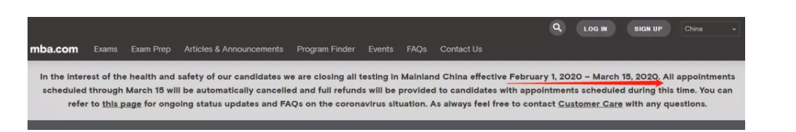 GMAT考试官方昨日宣布,为持续保障考生的身体健康与安全,经与教育部考试中心商讨,现决定自 即日起至2020年3月15日期间关闭在中国大陆的所有考试中心。所有考生在此期间内的考试将被取消并安排全额退款。自即日起至2020年3月31日期间,暂不接受任何新的考试预约。